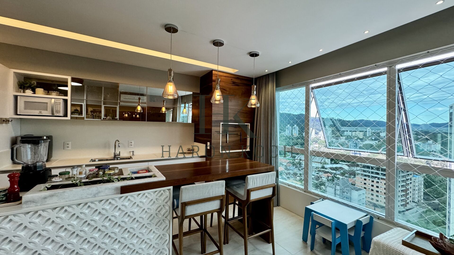 São 3 suítes, lavabo, sala e cozinha, churrasqueira integrada com a cozinha, ampla área de serviço, 100% mobiliado, climatizado e com aquecimento à gás.